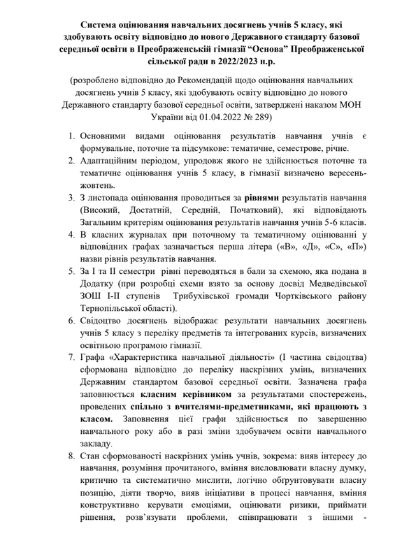 Система оцінювання НУШ 5 клас, гімназія "Основа"