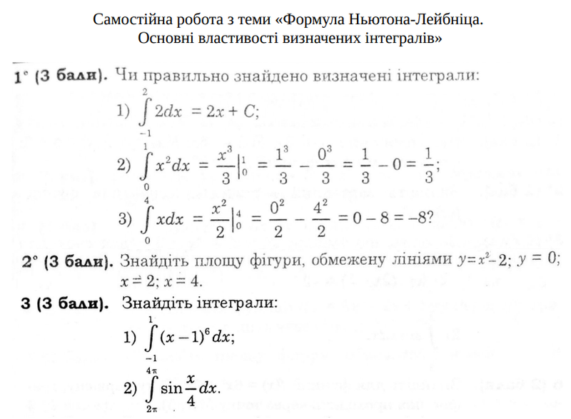 Тема уроку. Розв'язування задав і вправ з теми "Визначений інтеграл". Самостійна робота