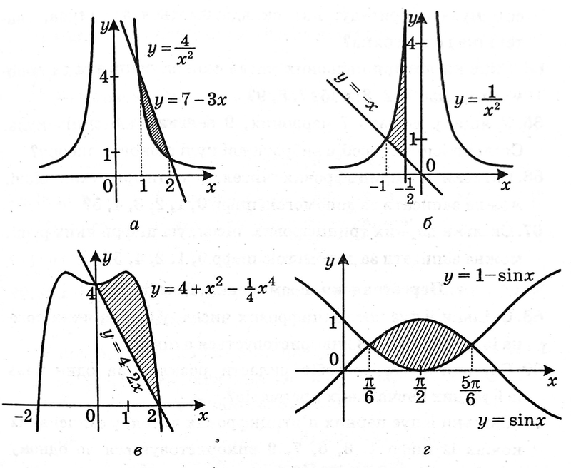 2) Запишіть інтеграли, за допомогою яких обчислюються площі плоских фігур, зображених на малюнках б, в і г.